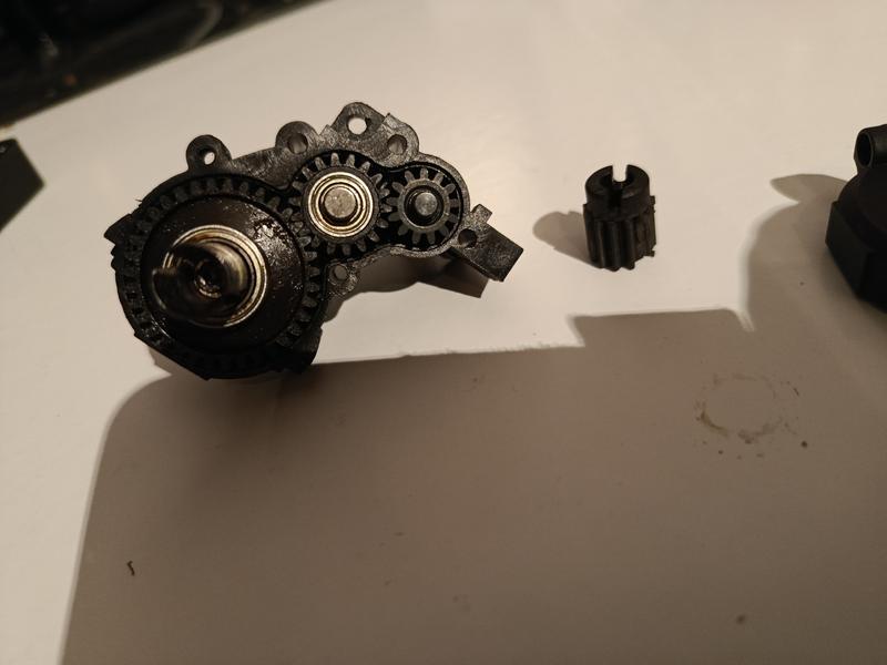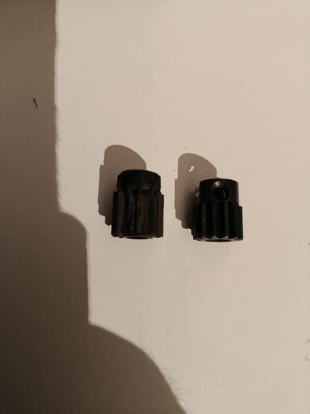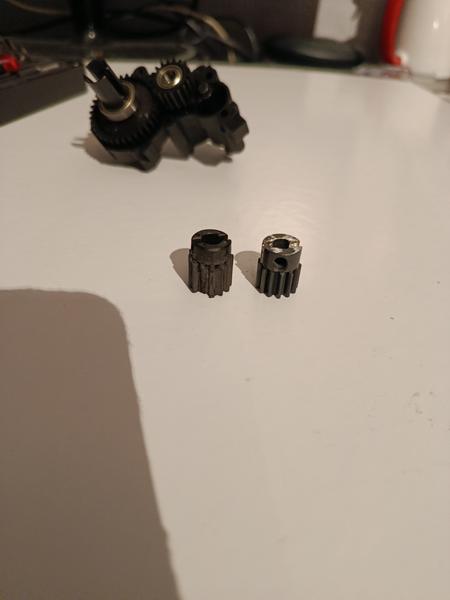Marre de ruiner le pignon de 13 de la boite de vitesse. j'en suis à 3 en 1 mois. j'ai pu trouver sur Ali un pignon de la bonne largeur en métal, qui va bien compléter celle ci. un poil plus bas d'1 mm, mais adaptable très facilement en faisant l'encoche à la dremel, tout est parfait, le centre fait bien 5mm. (AJRC 32P M0.8 5mm 13T) qui à la base est pour le 1/10 slash trx4. on verra bien sur le terrain une fois tout remonté et huilé.