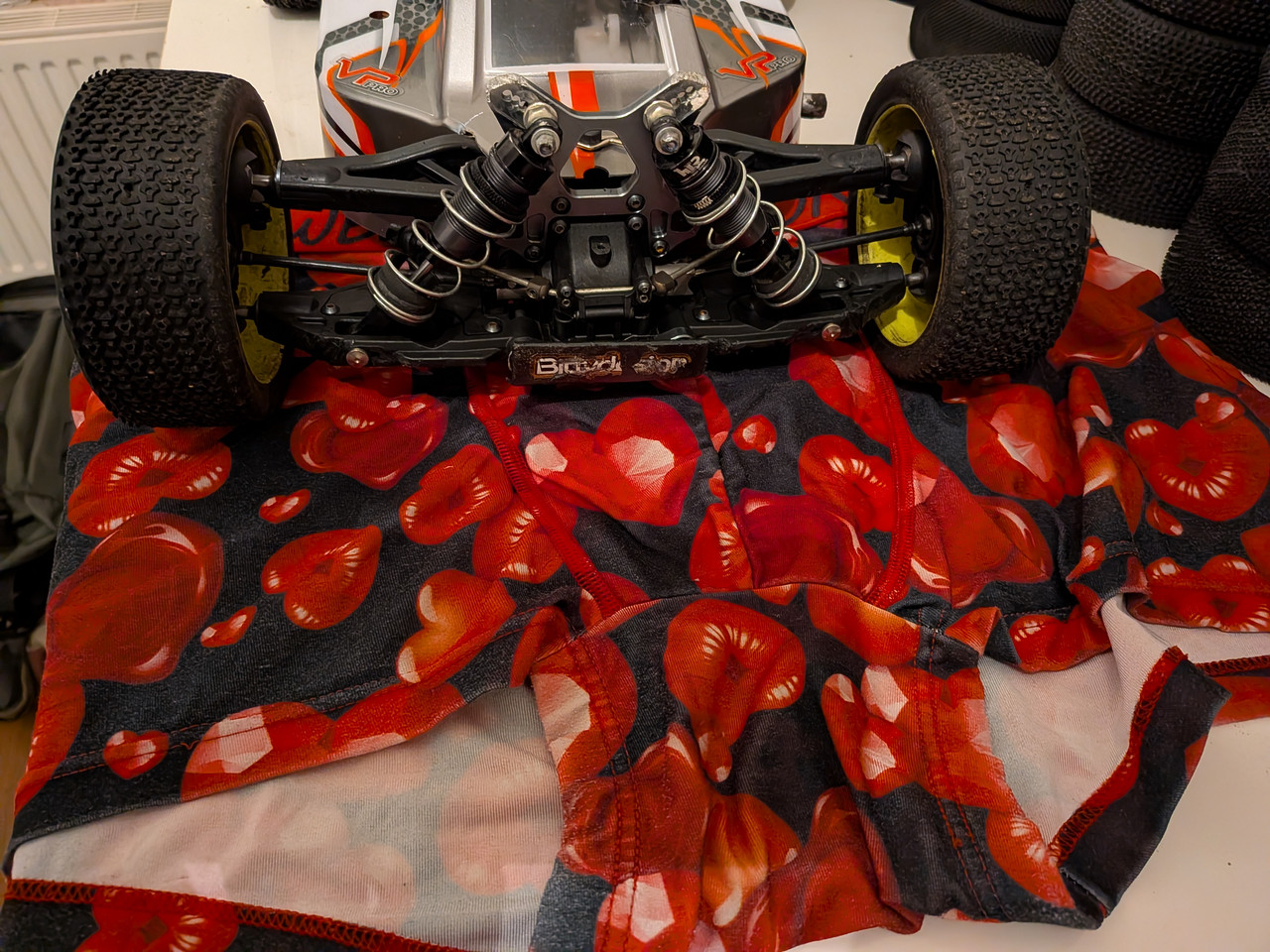 Bon ayant fait migrer le combo elec vers le truggy de mon frere du coup j'ai cette saison remis en route la version th , le chassis glissai un poil du scrotum en reac du coup j'ai baissé un poil l'arriere avec un peut moins d'anti cabrage sur le meme train et