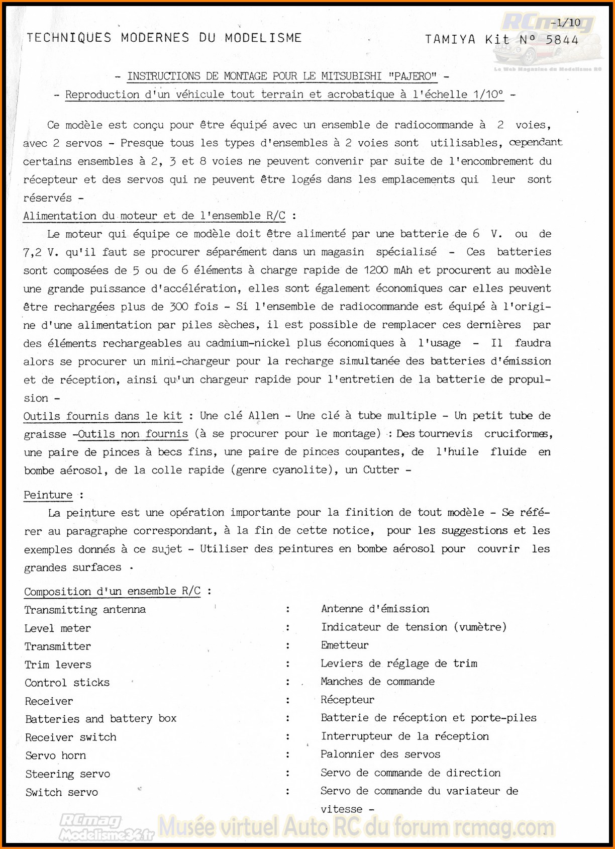Notice en français du Tamiya Pajero rallye 58044 de 1984 - Collection RCmag