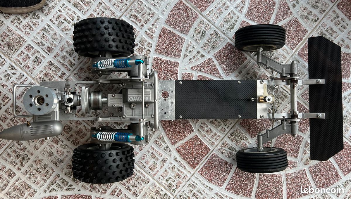 Enduro 83, Moteur OS, carro repro de 84. Roule régulièrement, fiabilisé avec des engrenages laiton au niveau des roues. Engrenages d'origine ok et présents. Triangles supérieurs 3d installés, pièces d'origine fournies.